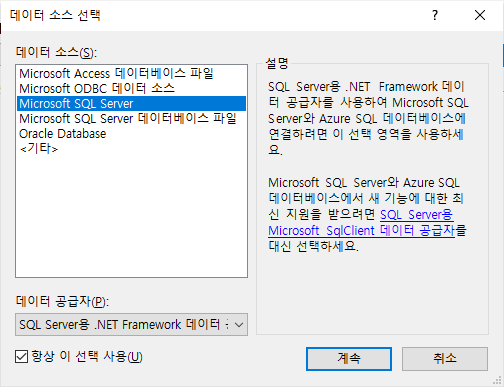 "Microsoft SQL Server"를 선택하고, [계속] 버튼을 누릅니다.