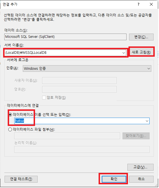 6. 로컬DB에 연결하기 위해서 서버 이름에 다음과 같이 입력하고, [새로 고침] 버튼을 누릅니다.