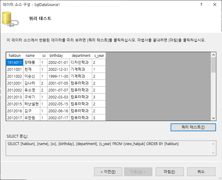 8. [쿼리 테스트] 버튼을 누르고 결과를 확인한 후 [마침] 버튼을 누릅니다.