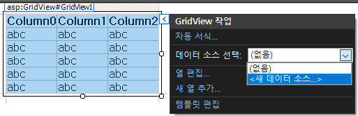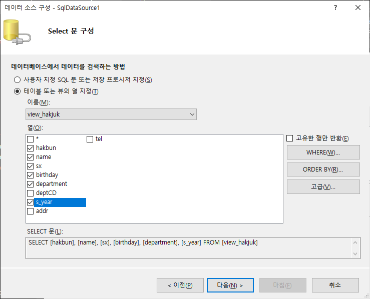 다음 화면이 나타나면 테이블이나 뷰를 선택하고, GridView 컨트롤에 출력할 항목을 선택합니다.