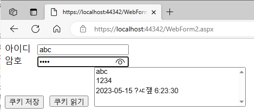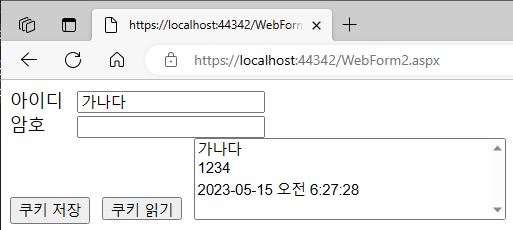 다음 예제는 HttpCookie 클래스를 이용해서 쿠키 정보를 저장하고 읽어오는 예제입니다.