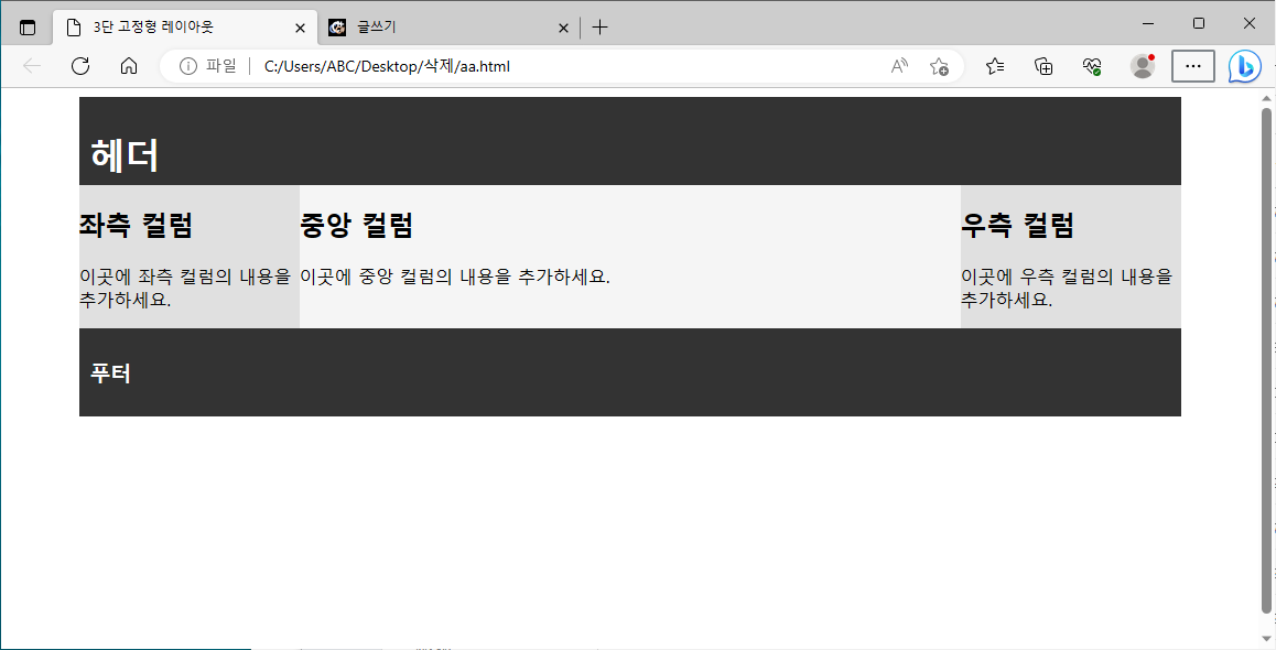 아래의 코드는 간단한 3단 고정형 레이아웃을 만듭니다.