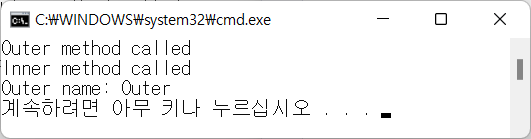 | Outer method called Inner method called Outer name: Outer |