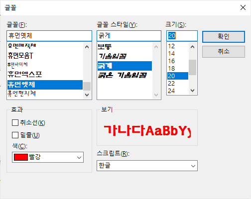 아래 그림은 폰트 대화상자를 나타낸 것입니다.