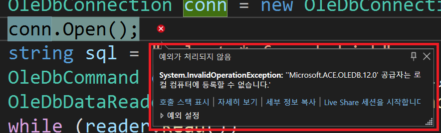 System.InvalidOperationException: "Microsot.ACE.OLEDB.12.0' 공급자는 로컬 컴퓨터에 등록할 수 없습니다.'"