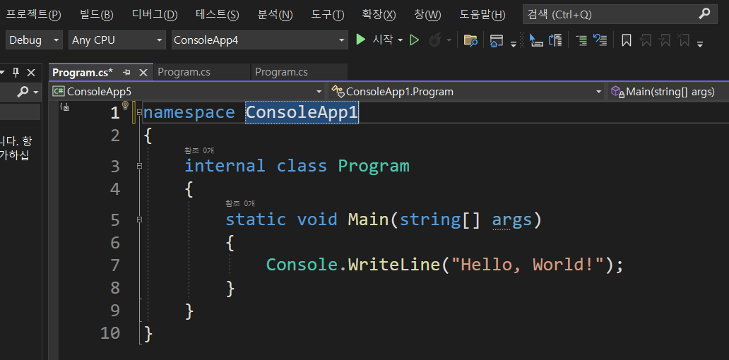비주얼스튜디오 2022에서 프로젝트를 "콘솔 앱(.NET Framework)"를 선택해서 만들 때 자동으로 생성되어 있는 코드입니다.