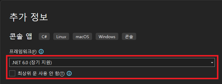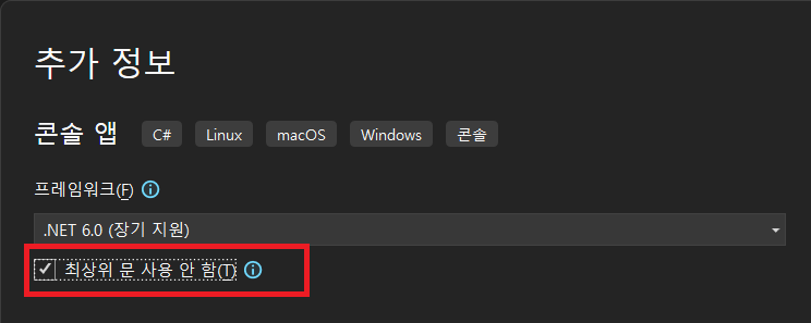 이번에는 "최상위 문 사용 안 함"을 체크라고 프로젝트를 생성해 보겠습니다.