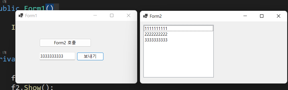 7. Form2에 매개변수 Form1를 받는 생성자를 추가합니다.