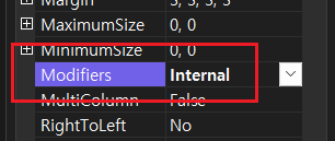 Modifiers 속성은 해당 컨트롤에 할당된 액세스 한정자입니다. 기본값은 private로 설정되어 있어서 다른 폼(또는 다른 클래스)에서 접근이 금지되어 있습니다. 이 속성값을 public 또는 internel로 설정하면 다른 폼으로 부터 값을 받을 수 있게 됩니다.