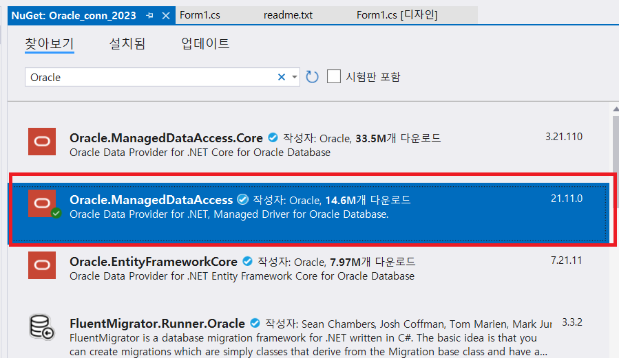 [찾아보기]에서 "Oracle"를 입력합니다. 아래의 체크한 항목을 선택합니다.