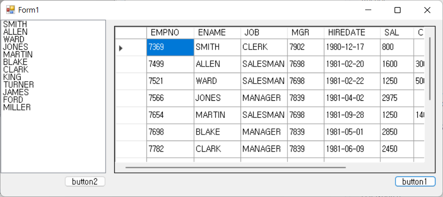 2. 폼에 ListBox 1개, DataGridView 1개, 버튼 2개를 배치합니다 - 아래의 결과 화면을 참고합니다.