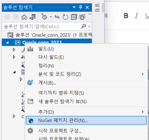 3. 솔루션 탐색기에서 "NuGet 패키지 관리"를 선택합니다.