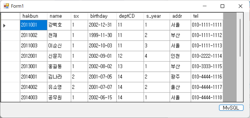 3. 폼(Form)에 데이터그리드뷰 1개와 버튼 1개를 추가합니다 - 아래의 결과 화면을 참고합니다.