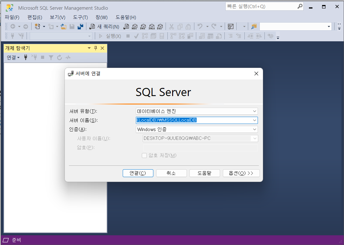 LocalDB에 연결하기 위해서 서버 이름에 다음과 같이 입력합니다.