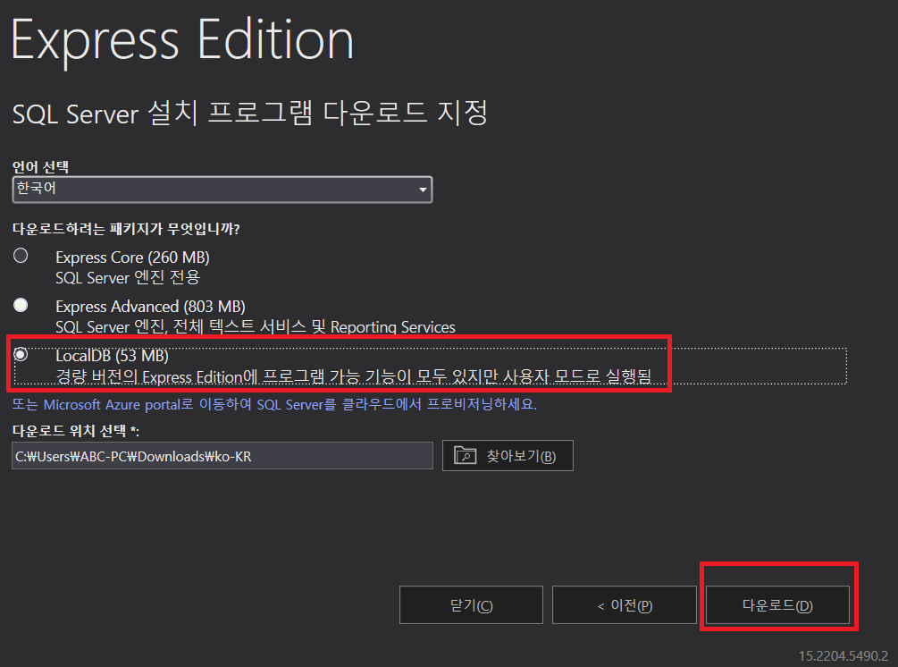 4. "LocalDB"를 선택하고, [다운로드] 버튼을 누릅니다.