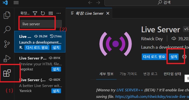 2. 왼쪽의 확장 기능을 선택하고, “Live Server”를 입력해서 설치합니다.