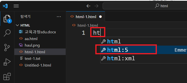 빈 화면에서 “html:5”를 입력하거나 아래와 같이 선택합니다.