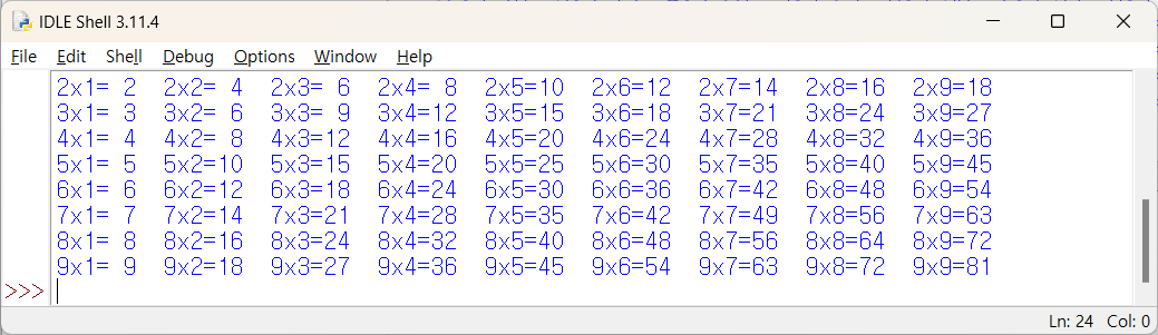 print("%dx%d=%2d " % (i,k,k*i), end="")