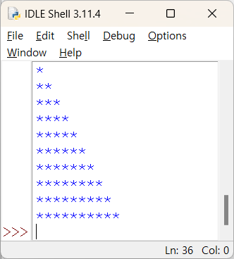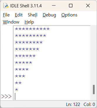 파이썬의 반복문 for를 이용해서 여러 가지 모양의 삼각형 모양의 별(*)를 출력하는 코드입니다.