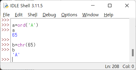 | chr() 함수는 ord 함수의 반대되는 함수라고 할 수 있습니다. 정수에 해당하는 유니코드 문자를 반환합니다. |