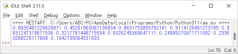 다음 코드는 0과 1 사이의 실수 난수를 10개 생성합니다.