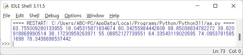 다음 코드는 0부터 100까지의 실수 난수를 10개 생성합니다.
