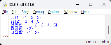 | set1: {1, 2, 3} set2: {3, 4, 5} 합집합: {1, 2, 3, 4, 5} 교집합: {3} 차집합: {1, 2} |