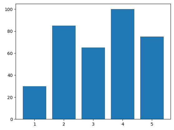 plt.bar([1,2,3,4,5], [30,85,65,100, 75])