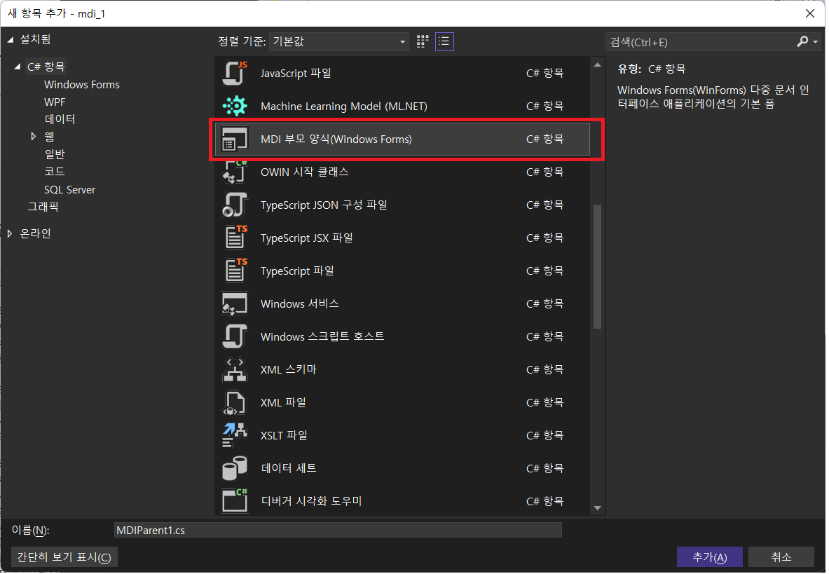 1. "MDI 부모 양식(Windows Forms)"으로 만들기