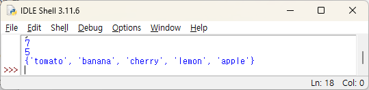 - 가변성(mutable): 집합은 가변 객체이며, 원소를 추가하거나 제거할 수 있습니다.