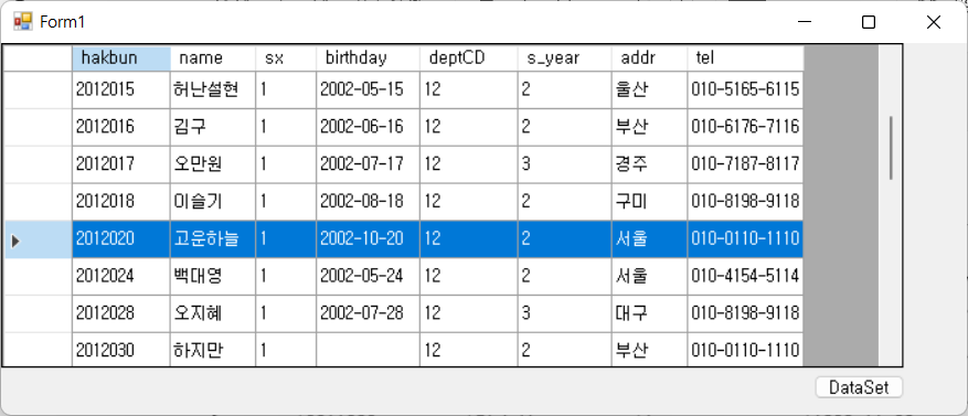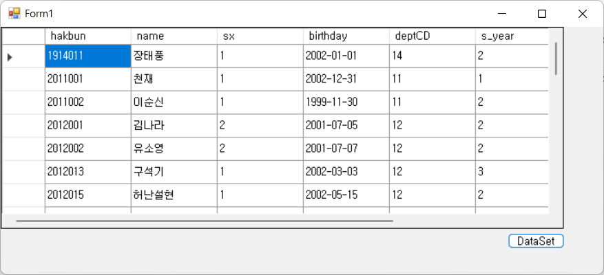 데이터그리드뷰(dataGridView) 컨트롤에 "haksa" 데이터베이스의 "student" 테이블을 출력하는 C# 코드입니다.