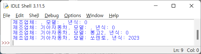 car2 = Car('기아자동차', '쏘렌토', 2023)
