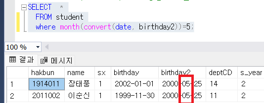 SELECT * FROM student where month(convert(date, birthday2))=5; |