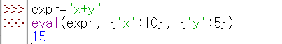 인수 expression은 문자열로 된 파이썬 식이며, globals는 딕셔너리(dictionary)이며, locals은 모든 객체(object)가 맵핑될 수 있습니다.
