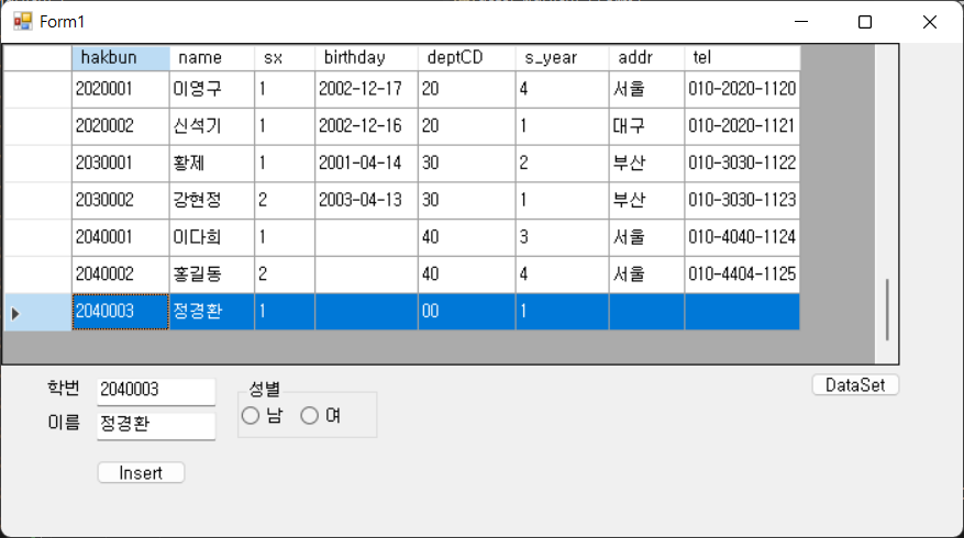 string sql = "insert into student(hakbun, name, sx, deptCD) " +