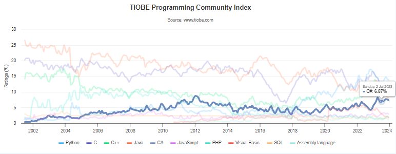 | 2024년 1월 TIOBE index, 프로그래밍 언어 순위, 2023년 프로그래밍 언어는 C# (0) | 2024.01.08 |