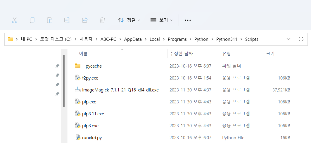 | c:\ → 사용자 → (컴퓨터 이름) → AppData → Local → Programs → Python → (파이썬 버전) → Scripts |