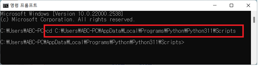 c:\ → 사용자 → (컴퓨터 이름) → AppData → Local → Programs → Python → (파이썬 버전) → Scripts |