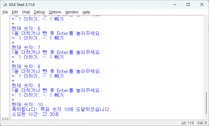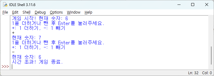 컴퓨터가 시작 숫자를 1에서 10까지 범위에서 무작위로 선택하고, 사용자가 1을 더하거나 빼는 입력을 받아 목표 숫자에 도달하도록 하는 간단한 카운트다운 게임을 구현한 것입니다. 게임의 제한 시간은 30초로 설정되어 있습니다. 필요에 따라 목표 숫자와 시간 제한을 조절하여 사용할 수 있습니다.