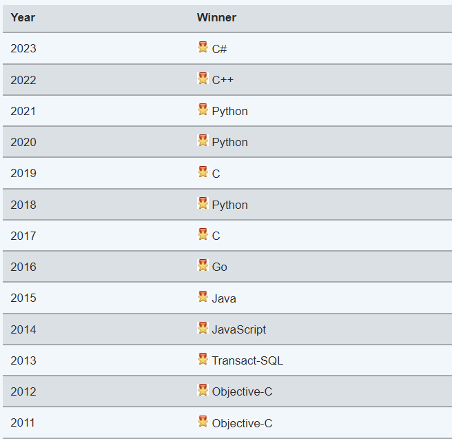 "올해의 프로그래밍 언어" 수상자를 모두 나열한 명예의 전당은 아래와 같습니다. 이 상은 한 해 동안 가장 높은 평점 상승을 보인 프로그래밍 언어에 수여됩니다.