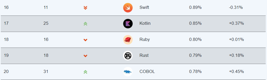 C# 외에도 지난해 TIOBE 지수에는 흥미로운 변화가 많았습니다. 포트란(Fortran)과 코틀린(Kotlin)은 예전에 가장 인기 있었던 R과 Perl을 대신하여 영구 상위 20위 플레이어가 되었습니다. Fortran은 좋은 라이브러리를 사용하여 숫자를 계산하는 데 매우 적합하며 많은 도메인에서 대학에서 가장 선호하는 언어로 남아 있습니다. Kotlin은 배우고 작성하기 쉬운 Java의 경쟁자입니다.