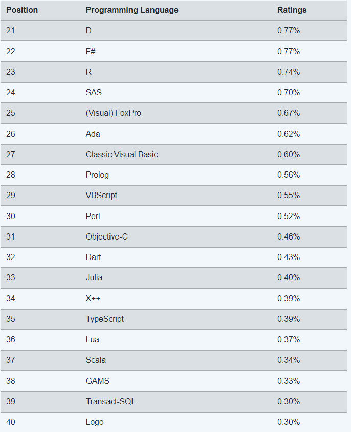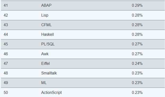 프로그래밍 언어의 전체 상위 50개 목록은 다음과 같습니다. 이 개요는 언어가 누락된 경우가 있을 수 있으므로 비공식적으로 게시됩니다. 프로그래밍 언어가 부족하다고 생각되면 tpci@tiobe.com으로 알려주시기 바랍니다. 또한 우리가 모니터링하는 모든 프로그래밍 언어의 개요를 확인하십시오.