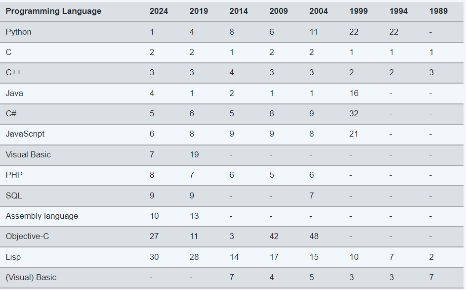 더 큰 그림을 보려면 아래에서 수년 전 상위 10개 프로그래밍 언어의 위치를 찾아보세요. 이는 12개월 동안의 평균 순위입니다.