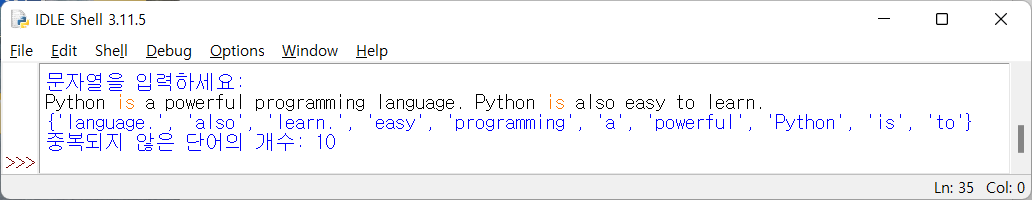 입력된 문장에서 중복을 제외한 단어의 개수를 세는 파이썬 프로그램입니다.