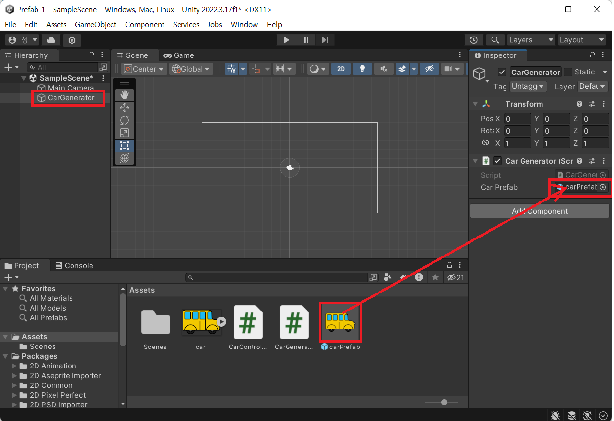 10. Hierarchy 창에서 CarGenerator를 선택하고, Inspector 창에서 "Car Prefab"를 찾아서 프리팹을 연결합니다.