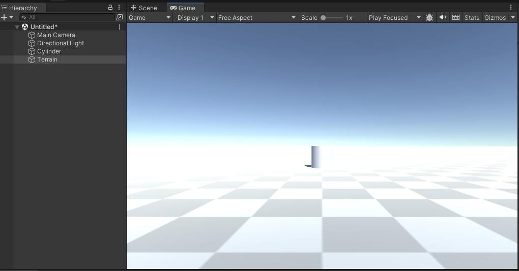 2. Hierarchy 창에 "Terrain"과 "Cylinder" 3D 오브젝트를 추가합니다.