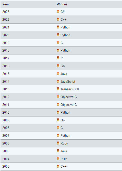 "올해의 프로그래밍 언어" 수상자를 모두 나열한 명예의 전당은 아래와 같습니다. 이 상은 한 해 동안 가장 높은 평점 상승을 보인 프로그래밍 언어에 수여됩니다.