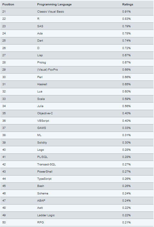 프로그래밍 언어의 전체 상위 50개 목록은 다음과 같습니다. 이 개요는 언어가 누락된 경우가 있을 수 있으므로 비공식적으로 게시됩니다. 프로그래밍 언어가 부족하다고 생각되면 tpci@tiobe.com으로 알려주시기 바랍니다. 또한 우리가 모니터링하는 모든 프로그래밍 언어의 개요를 확인하십시오.