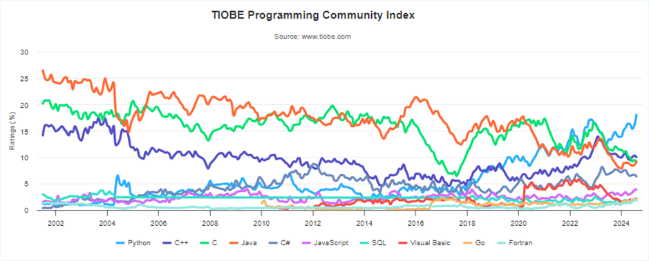 Home » TIOBE Index TIOBE Index for August 2024 August Headline: Python is chasing Java's TIOBE index records This month, Python has a ranking of more than 18% for the first time in its history. The last time a language hit more than 18% was Java in Novemb