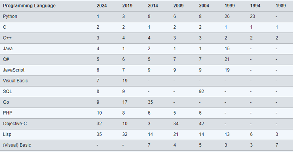 더 큰 그림을 보려면 아래에서 수년 전 상위 10개 프로그래밍 언어의 위치를 찾아보세요. 이는 12개월 동안의 평균 순위입니다.